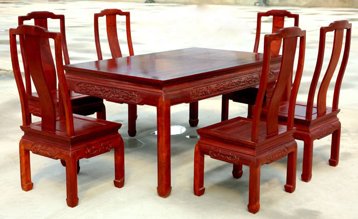 江蘇中尊木業(yè)有限公司餐廳系列產品:如意七件套如意餐枱、如意餐椅,餐廳十一件套富貴圓桌、富貴餐椅等。