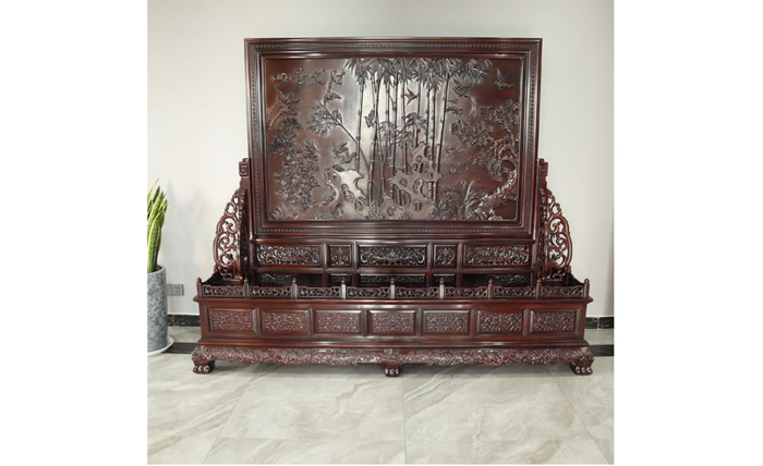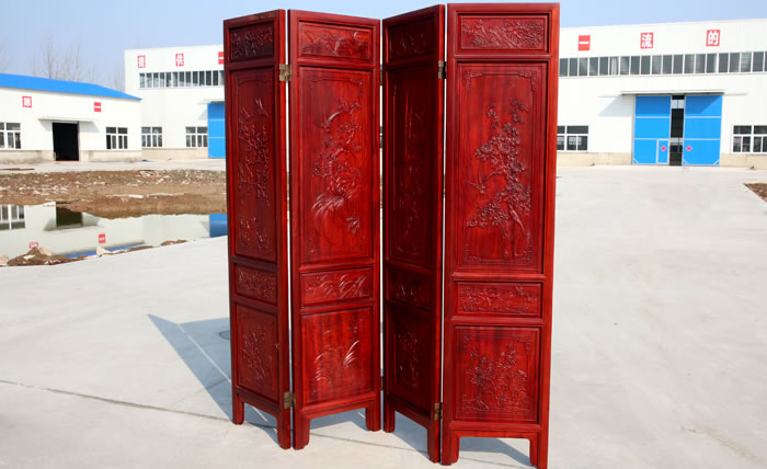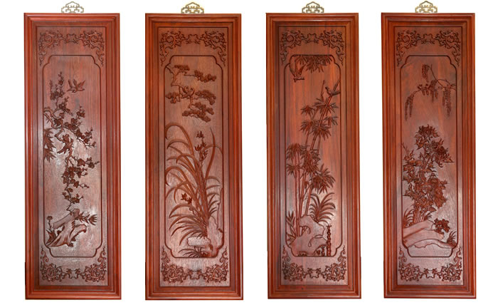 江蘇中尊木業(yè)有限公司屏風系列產品:梅蘭竹匊掛屏、四季花折屏四件套等。