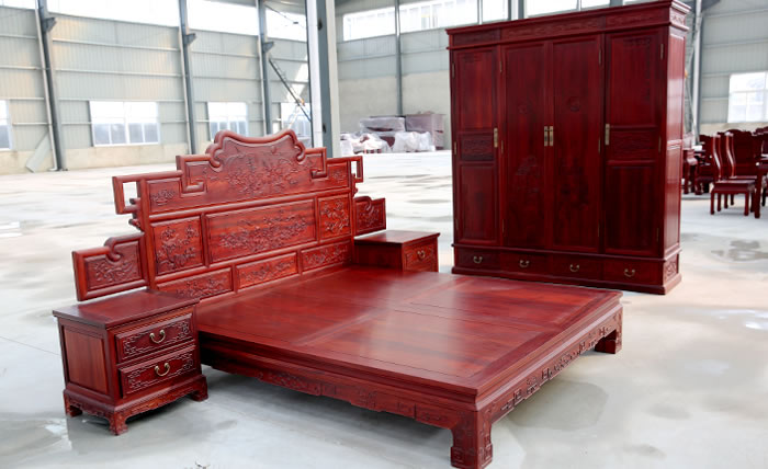 江蘇中尊木業(yè)有限公司臥室系列產品:佛光普照大佛龕,臥房四件套富貴大床、富貴大床床邊柜、四門衣柜等。